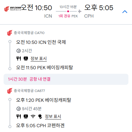 코펜하겐과 헬싱키 둘 중 어디를 먼저 IN 할지 고민되면 항공권을 조회해 보면 된다. 올해 25년 8월 기준으로 조회한 항공권들 중에 최소 시간 & 최소 경유 위주로 찾아봤었다. 코펜하겐은 중국 북경에서 경유 (13hr 15 min)했어야 했고, 헬싱키는 인천공항에서 직항 (11hr 50 min)이 있었다.