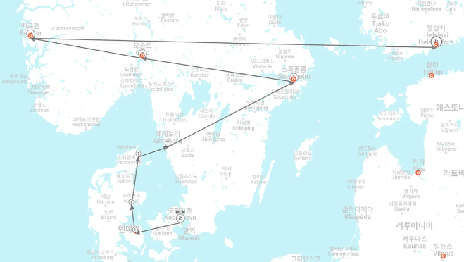 이렇게 여행한다고 가정해 보면, 이동 거리도 늘어나고 시간도 소비되기 때문에 비효율적이다. 가고 싶은 도시들을 나라별로 열심히 찾아봤었는데.. 역시 4개국 여행은 3주로도 짧았다. (정확히는 17박 18일이다.) 어떻게든 열심히 고민해 봤지만, 경로가 엉키는 것 같아 눈물을 머금고 예테보리는 가지 않기로 결정했다. 그렇게 되면 눈과 마음이 평안해지는 이동 경로가 나오게 된다. 아래는 최종적으로 결정한 나의 여행 경로.